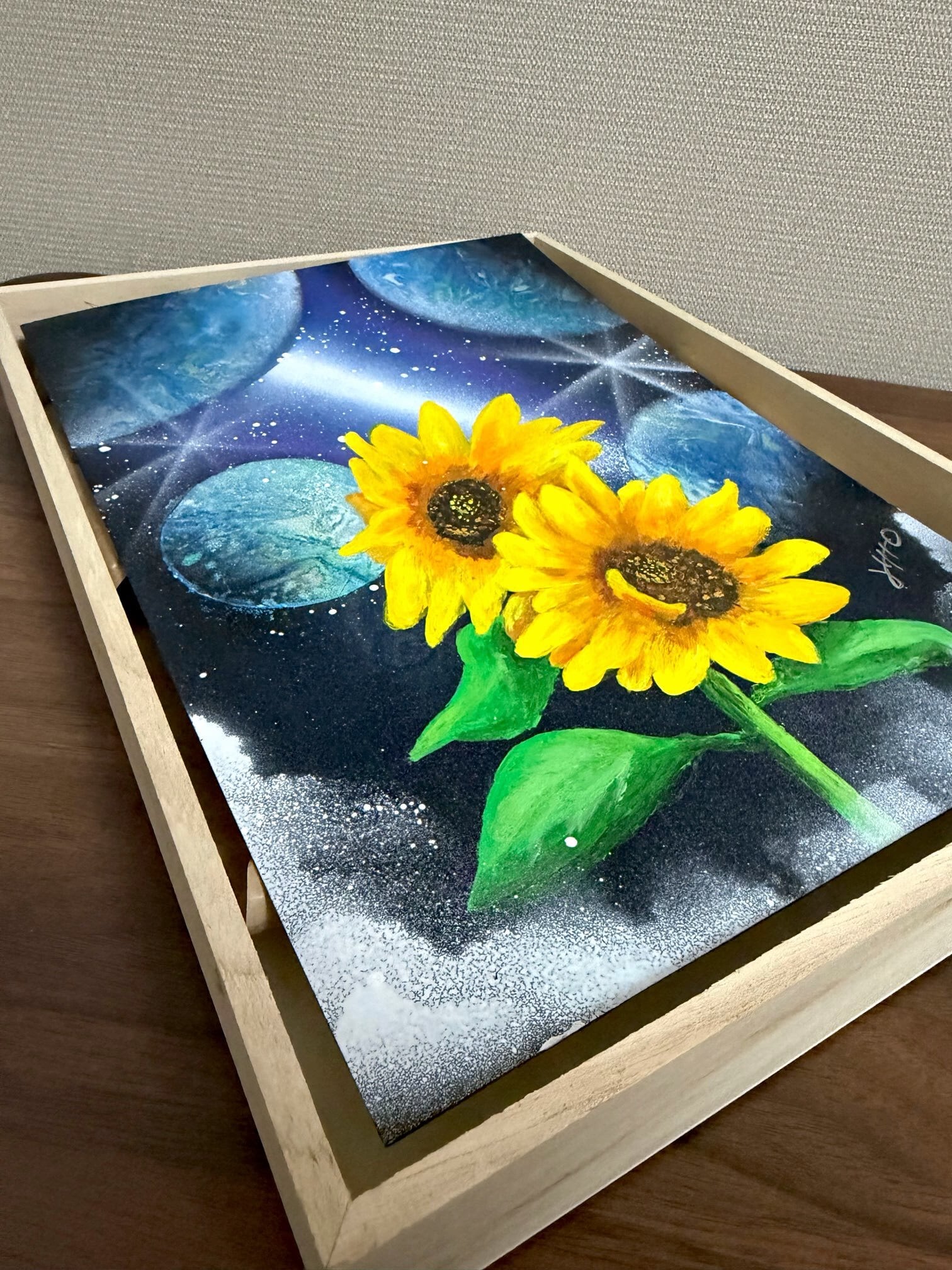 スプレーアートとアクリル画(筆)を組み合わせて制作した作品です。
